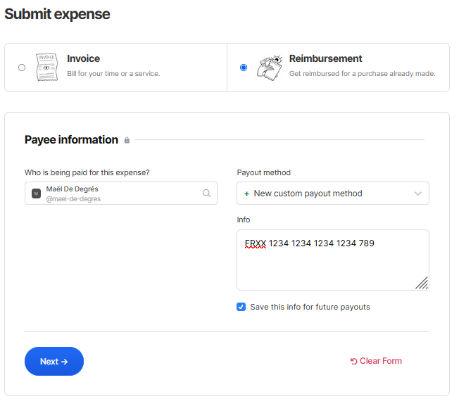 Et toujours mettre "custom payout method" pour ne pas avoir à rentrer les information associé au RIB (nom prénom...) et rester anonyme.